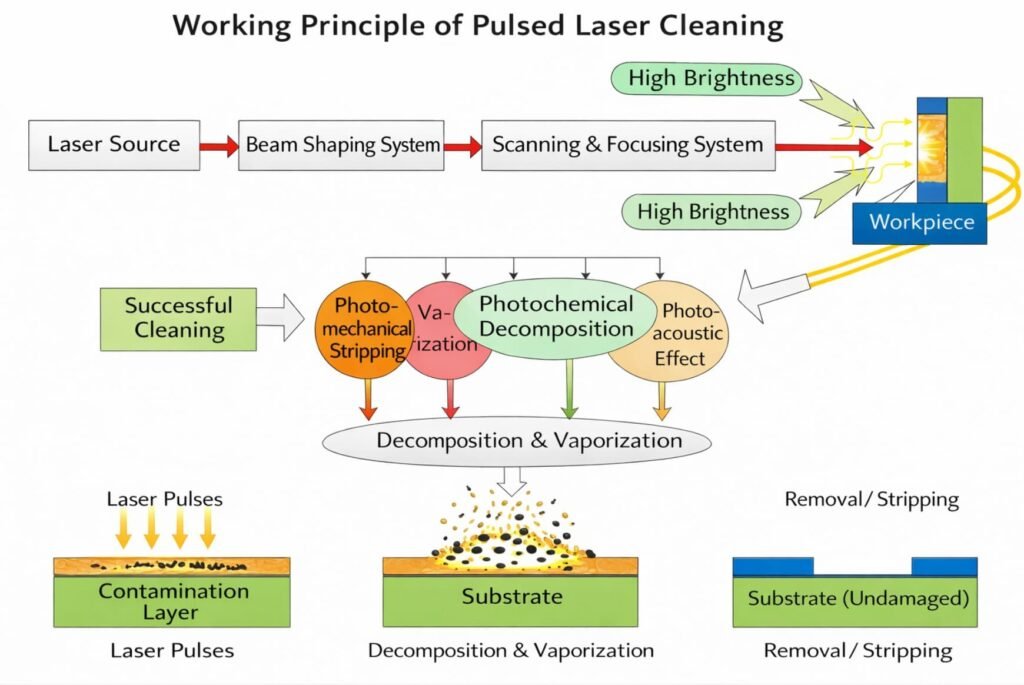Instead of removing contaminants through prolonged heating, pulsed laser cleaning uses instantaneous high-energy interaction to separate surface layers while keeping the base material intact.